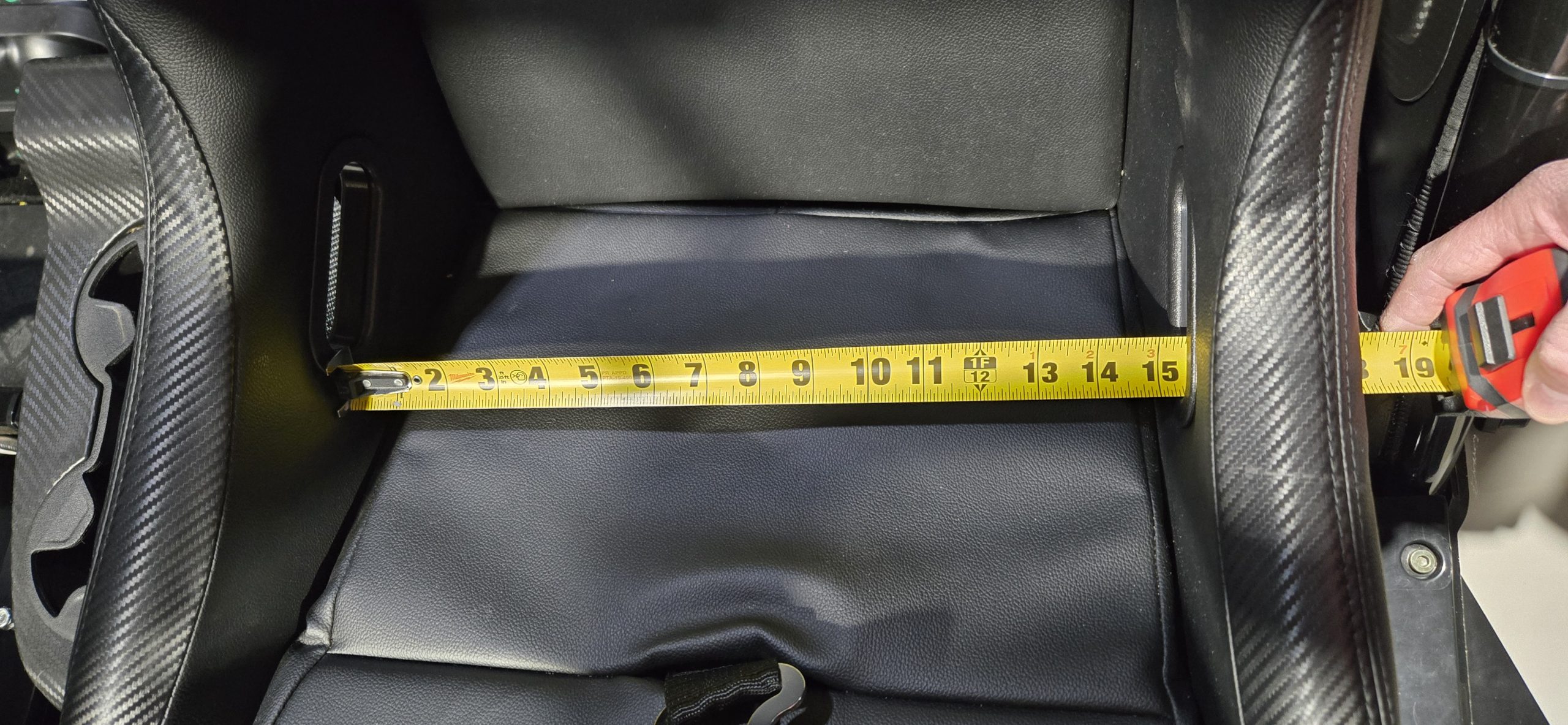 - The STANDARD seats are 15 1/4 inches across when measuring the inside of the seat-belt holes (See image 7 for reference)